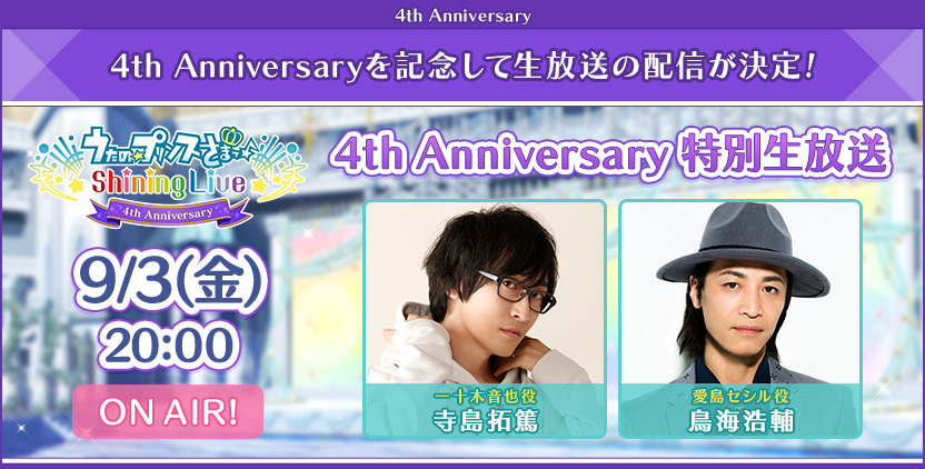 また、「うたの☆プリンスさまっ♪ Shining Live 4th Anniversary 特別生放送」が、9月3日(金)20時に配信決定!一十木音也役の寺島拓篤さん、愛島セシル役の鳥海浩輔さんをお招きし、シャニライに関する様々なコーナーや今後のアップデート情報などをお届けします。