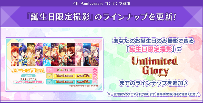 今回から新たに、過去のスペシャル撮影「Unlimited Glory」までに含まれるブロマイドを追加! さらに豪華になった「誕生日限定撮影」をぜひお楽しみください♪
