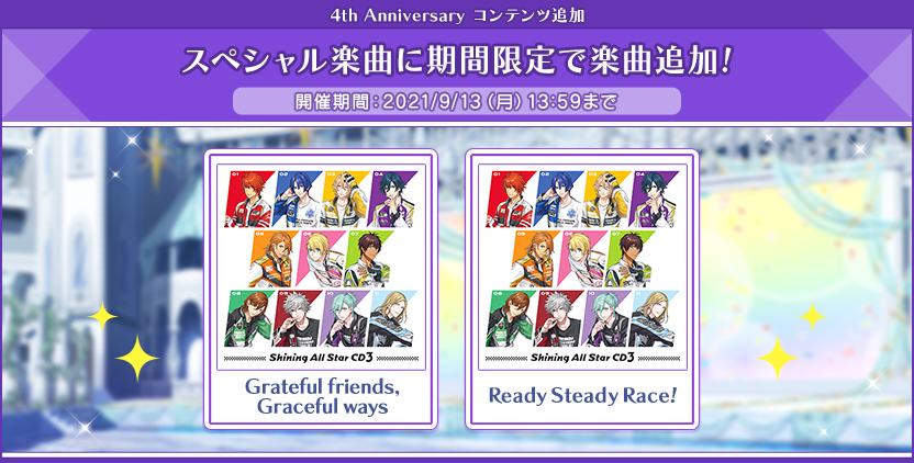 4th Anniversaryを祝して、「Grateful friends, Graceful ways」と「Ready Steady Race!」をスペシャル楽曲に追加。つねに挑戦し、前進し続ける音楽をシャニライでも体感しましょう。