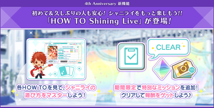 遊び方がわからない場合や、ミッションクリアのためにちょっと確認したい時など、ホーム画面のバナーまたは【その他>HOW TO Shining Live】より、ぜひチェックしてみてくださいね!
