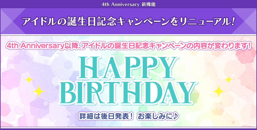 4th Anniversary以降、アイドルの誕生日記念キャンペーンの内容が変わります。今年も誕生日だけの特別なURブロマイドが登場するほか、アイドルのお誕生日をお祝いするための新しい特別イベントも……!