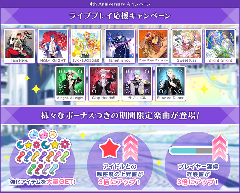 期間限定で様々なボーナスがついたスペシャル楽曲が登場。ライブプレイを応援する3つのキャンペーンを同時に実施します。