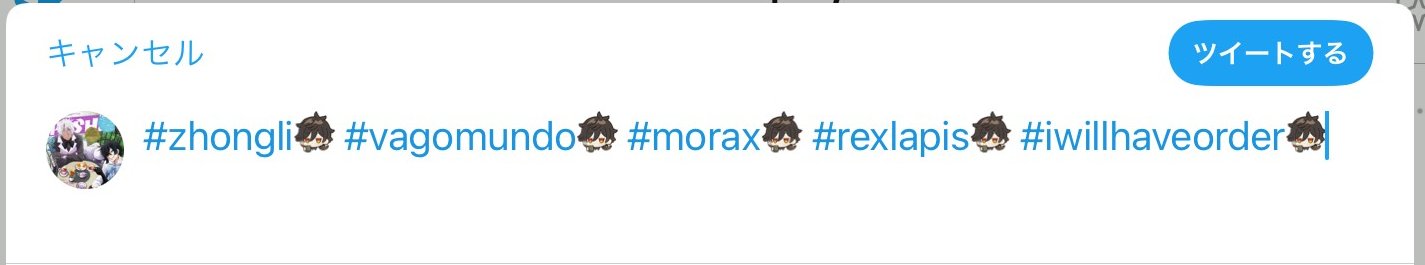 また、1つの絵文字に対応するハッシュタグも豊富で、例えば“鍾離”の場合は“#zhongli”だけでなく“#vagomundo”、“#morax”、“#rexlapis”、“#iwillhaveorder”などでも絵文字が表示されます。