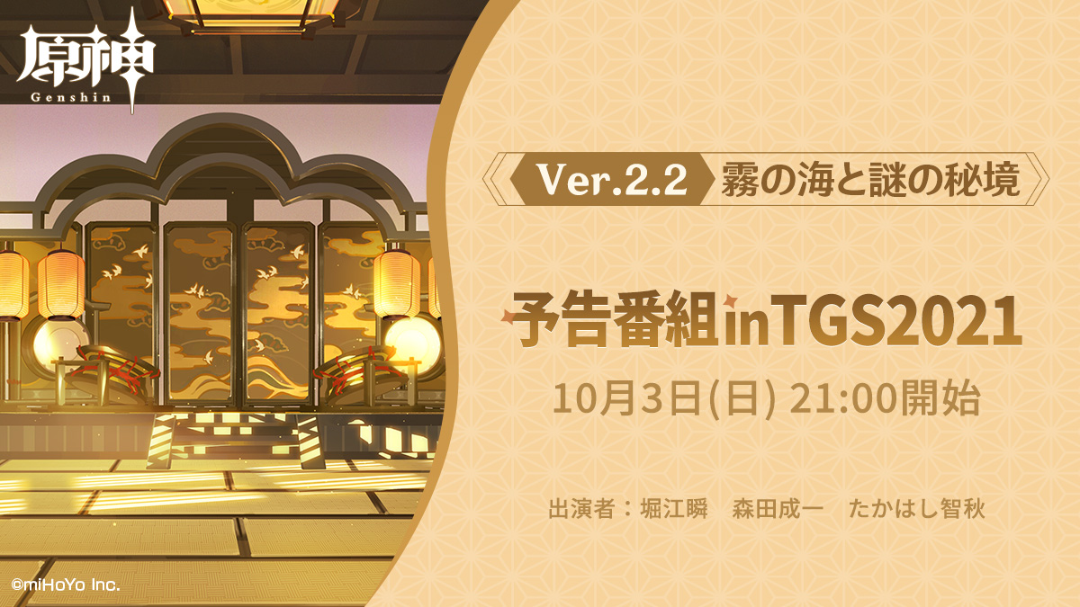 株式会社miHoYoは、マルチプラットフォーム対応オープンワールドRPG『原神(げんしん)』が、10月3日21:00より「TOKYO GAME SHOW 2021 ONLINE」にて、『Ver.2.2「霧の海と謎の秘境」予告番組inTGS2021』を放送することをお知らせいたします。
