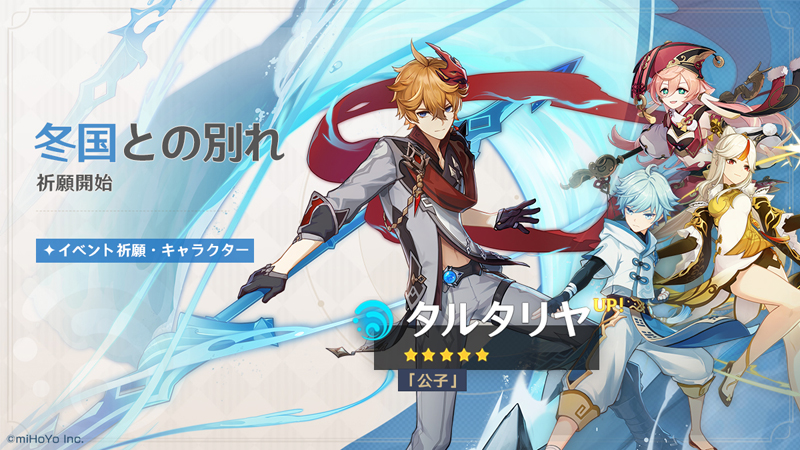 10月13日より、イベント祈願“冬国との別れ”を開催しました。期間中、星5キャラクター“「公子」・タルタリヤ(水)”などの出現確率が大幅にUPします。