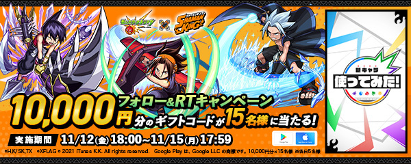 株式会社ミクシィが展開するエンターテインメント事業ブランド「XFLAG (エックスフラッグ)」は、スマホアプリのひっぱりハンティング RPG「モンスターストライク(モンスト)」と、TVアニメ『SHAMAN KING』とのコラボレーションを2021年11月14日12:00より開催します。