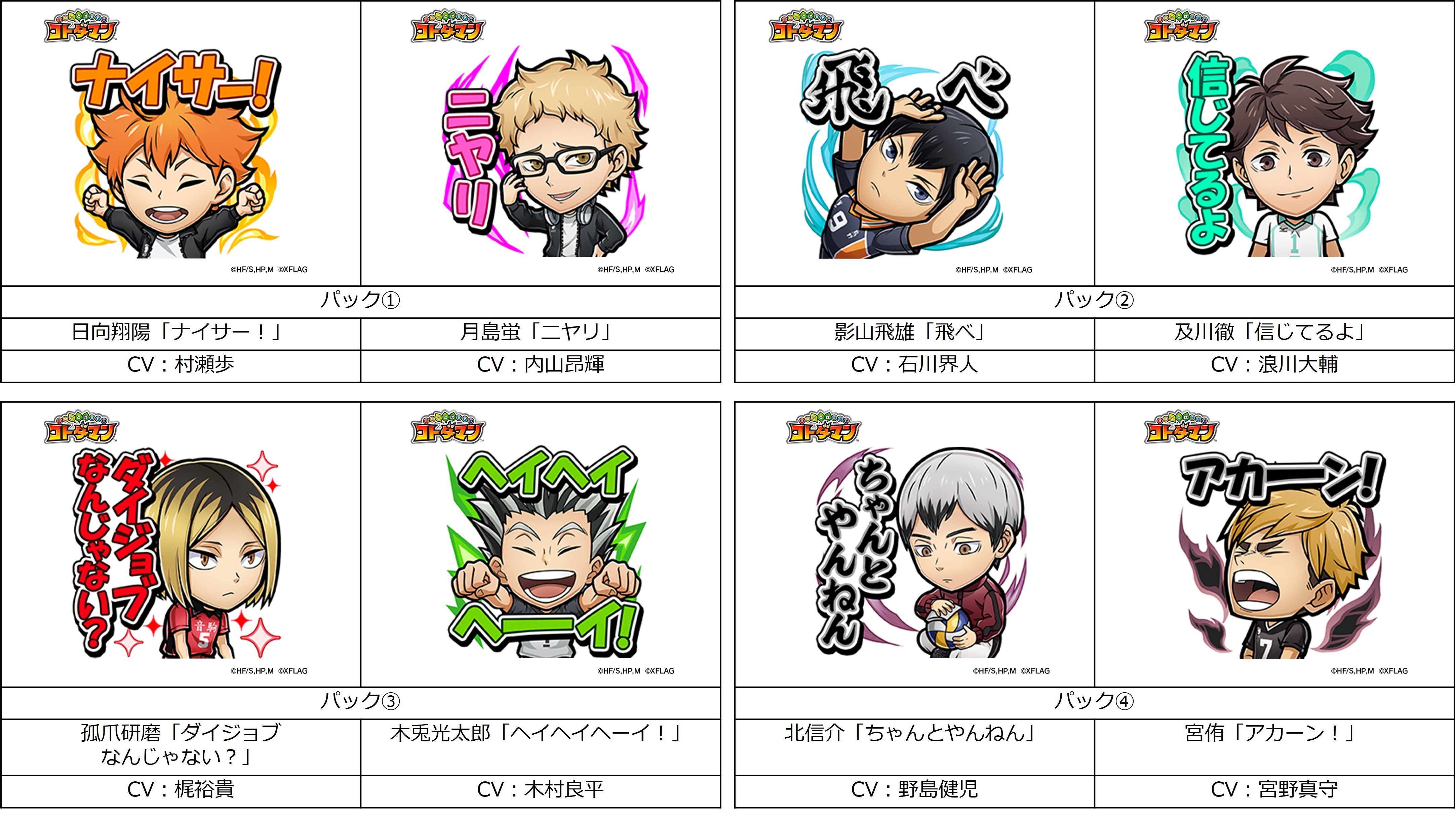 マルチプレイで使用できるアニメ『ハイキュー!!』登場キャラクターのコラボスタンプです。虹のコトダマ200個に、アニメ『ハイキュー!!』登場キャラクターのスタンプ2個(オリジナルボイス付き)がおまけで付いてくるパックとなっています。