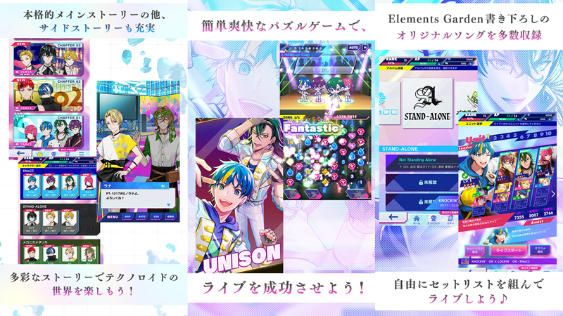 アンドロイドたちを育成し、オリジナルユニットでライブステージにチャレンジ。タップするだけの簡単爽快なパズルゲームでライブを成功させよう! 楽曲はすべてElements Gardenが制作。自分だけのセットリストでゲームを楽しもう。