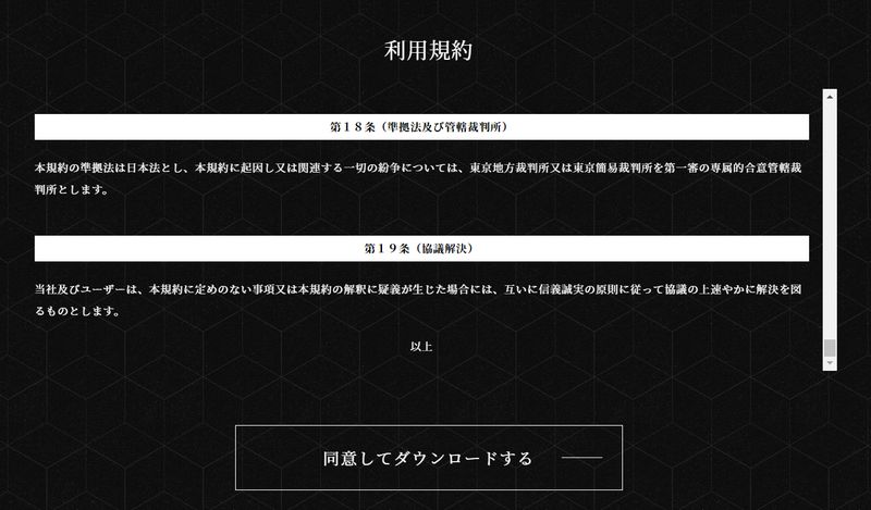 同欄の「ダウンロードする」ボタンを押下すると、ポップアップ画面に「利用規約」が表示されますので、こちらを最後までお読みいただきますと、ダウンロードをすることが可能となります。