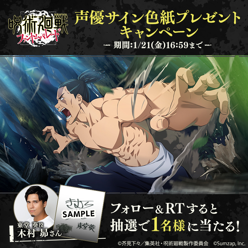 キャンペーンには、公式Twitterをフォローして該当ツイートをリツイートすることで参加できます。抽選で東堂葵役・木村昴さんをはじめとした京都府立呪術高等専門学校生のプレイアブルキャラクターを演じる声優陣6名のサイン色紙が当たります。