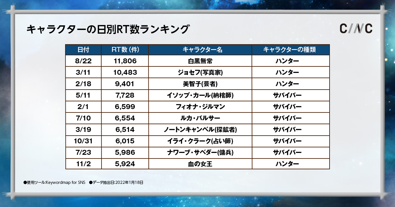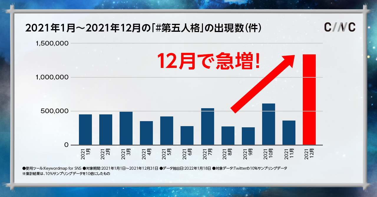 株式会社CINCは、自社で開発・提供するソーシャルメディアの分析・運用ツール「Keywordmap for SNS」を用いて、アプリゲーム分野で2021年12月にTwitterで反響の多かったハッシュタグの中から「#第五人格」に関する調査を行いました。
