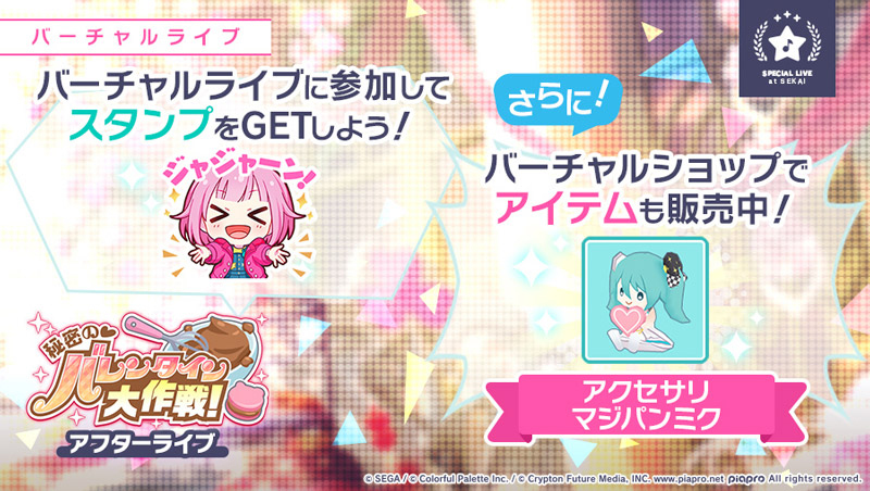また、“秘密の♡バレンタイン大作戦! アフターライブ”の開催に先立ち、1月31日からバーチャルショップにて、アクセサリ“マジパンミク”を販売中です。