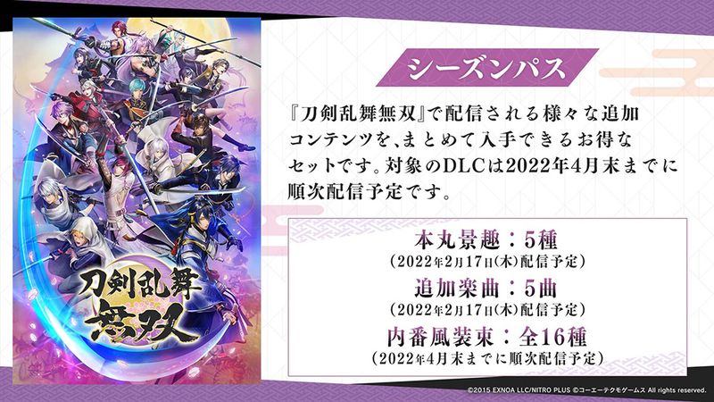 “本丸景趣”と“追加楽曲”は2月17日の本作発売と同時配信、“内番風装束”は4月末までに順次配信予定となっています。すべてのDLCをまとめて購入できるお得なシーズンパスも予定していますので、続報をお待ちください。