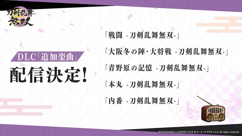 本丸の季節を変えることのできる『刀剣乱舞無双』オリジナルの“本丸景趣”や『刀剣乱舞-ONLINE-』で使用されているBGM5曲を本作向けに特別アレンジした“追加楽曲”、さらに刀剣男士の装束変更が可能となる“内番風装束”のDLCの配信が決定しました。