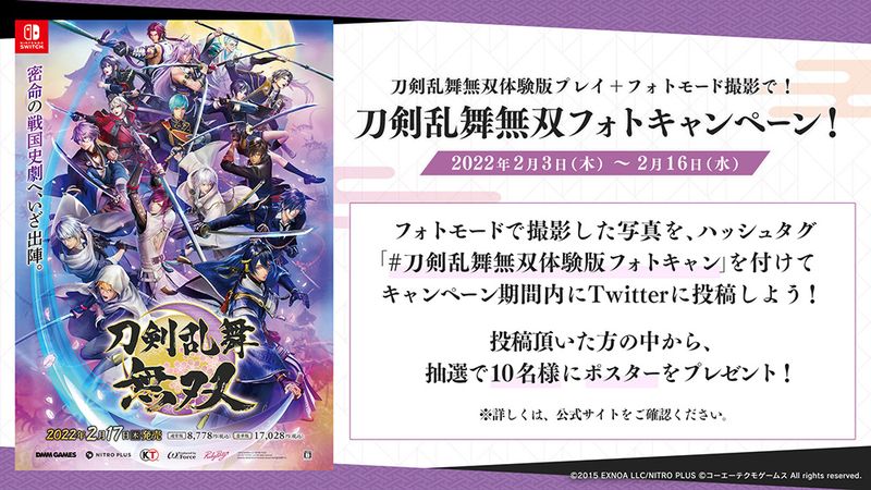 また、体験版配信を記念して非売品の“刀剣乱舞無双ポスター”(B2サイズ)が抽選で10名様に当たるフォトキャンペーンを開催します。ぜひ、刀剣男士を自由に撮影して自慢の写真をTwitterで投稿してください。