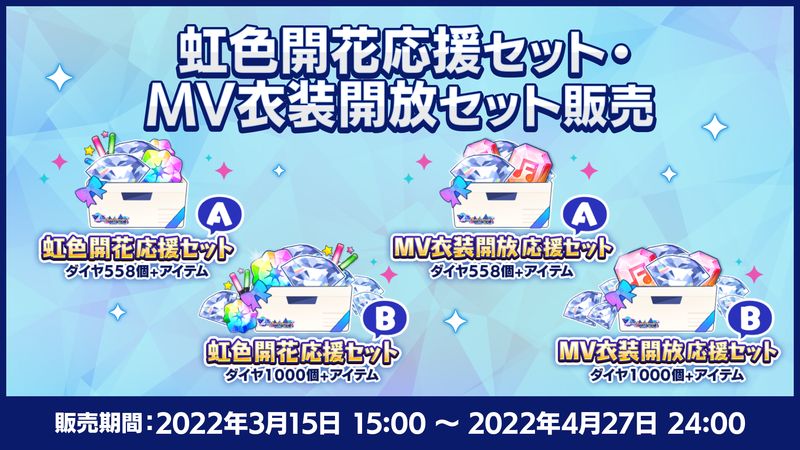 おまけダイヤの増量に加え、Basicでは虹色開花を行うために必要なレインボーピースが、Musicではイベントカードの衣装開放を行うために必要なイベント MV 衣装ピースがセットになったお得なセットです。