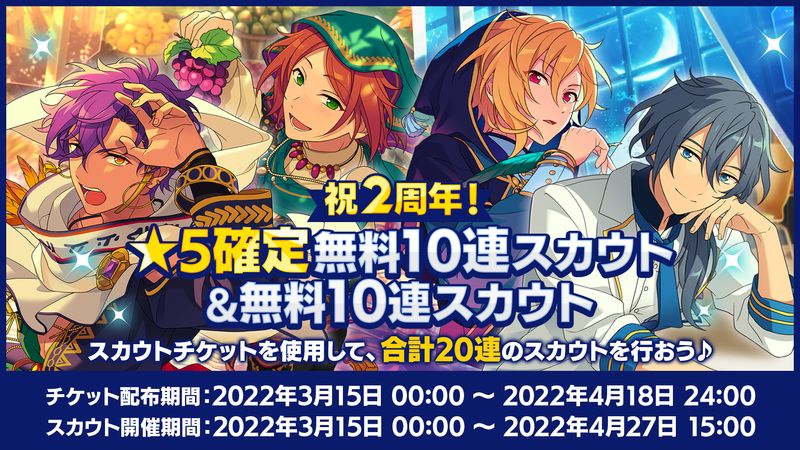 2ndアニバーサリーを記念した、無料スカウトを開催。期間中、ログインボーナスで“祝2周年!★5確定10連スカウトチケット”と“祝2周年!10連スカウトチケット”を獲得できます。スカウトチケットを使用して、合計20連のスカウトが行えます。
