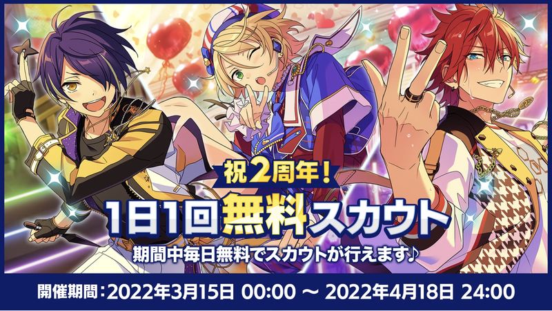 『あんさんぶるスターズ!!』は、2022年3月15 をもって大型アップデートから2年を迎えます。2ndアニバーサリーを記念し、アプリ内ではより『あんスタ!!』を楽しめるキャンペーンや“あんスタを始めるなら今!”なお得情報が盛りだくさんです。また、2ndアニバーサリー特設サイトも開設されています。