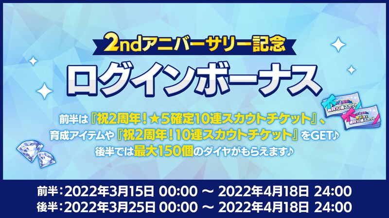 2ndアニバーサリーを記念したログインボーナスを開催。前半は初日に“祝2周年!★5確定10連スカウトチケット”、期間中7日間ログインで育成アイテムや“祝2周年!10連スカウトチケット”をGET!