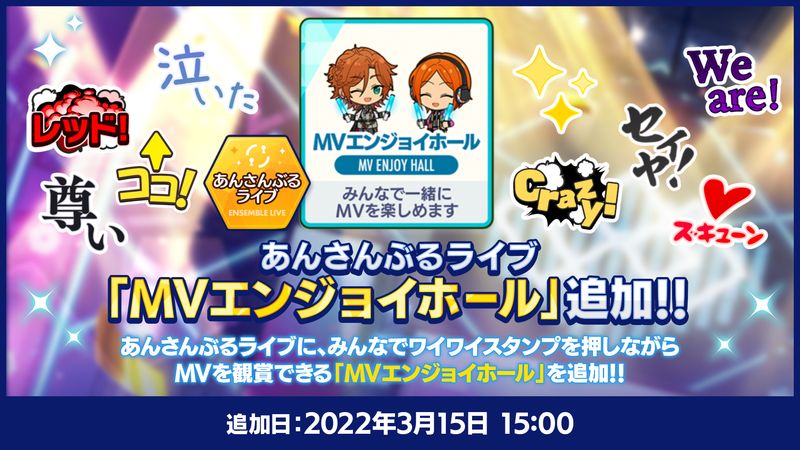 みんなでワイワイスタンプを押しながらMVを観賞できる“MV エンジョイホール”を追加! さらに、リズムゲームの腕を試す“ライブチャレンジ”にみんなで協力して挑戦する特別版が開催決定!