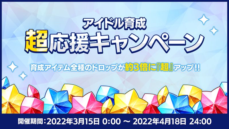 期間中、フェスプロデュース(Basic)/ライブ(Music)/お仕事にて、育成アイテム全種のドロップが約3倍に“超”アップ!! この機会にたくさんプレイして、たくさんアイドルを育成しましょう!!