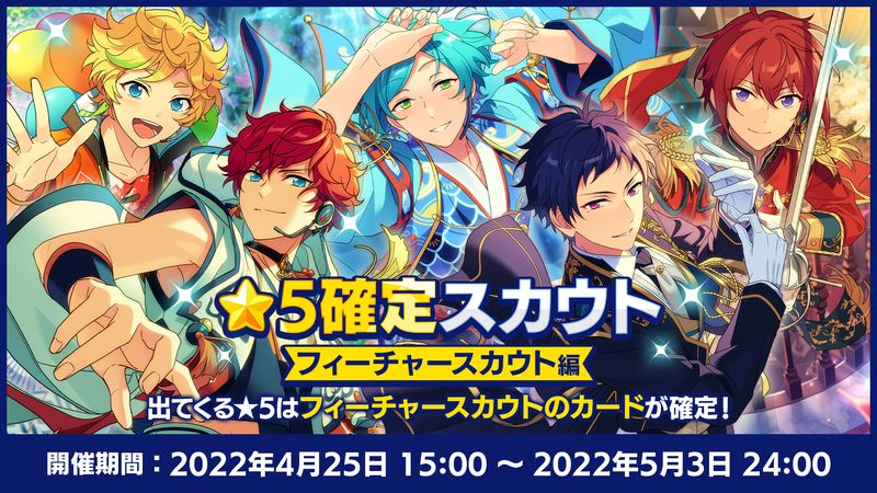 テーマスカウトとフィーチャースカウトで、それぞれ★5が1枚以上確定の10連スカウトを開催! 1人1回、有償ダイヤ200個で引くことが出来ます。