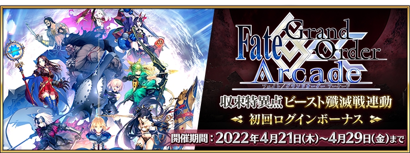 『Fate/Grand Order Arcade』の“ビースト殲滅戦”期間中に、20万鱗を撃破して“撃退成功”を達成することで、『Fate/Grand Order』の初回ログインボーナスで聖晶石10個をプレゼントする連動キャンペーンを実施いたします。