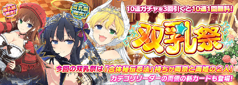 今回の双乳祭では、双乳祭限定カードが“両奈”と“両姫”の2枚が登場。さらに“両備”の新爆乳祭限定カードも登場します。“両奈”と“両姫”は、特殊な条件を満たすことで“合体秘伝忍法”を発動できます。