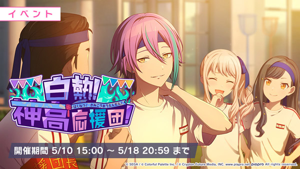 5月10日より、ゲーム内イベント“白熱!神高応援団!”を開催中です。イベント期間中、“ひとりでライブ”、“みんなでライブ”、“チャレンジライブ”(リズムゲーム)をプレイすることで、スコアに応じて“イベントP”と“イベントバッジ”を獲得できます。