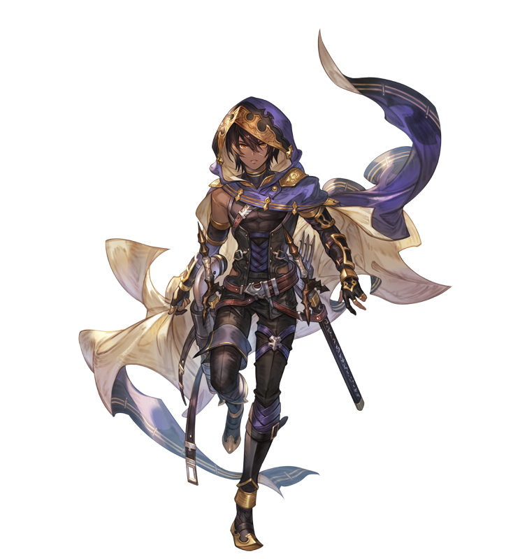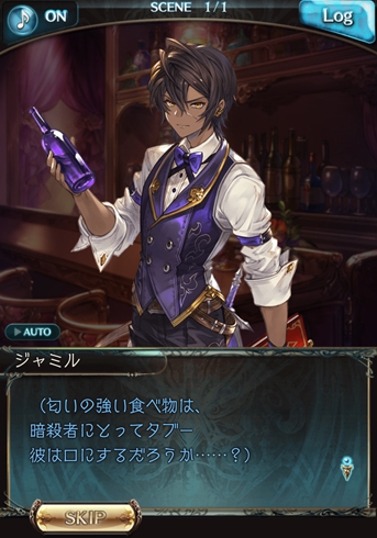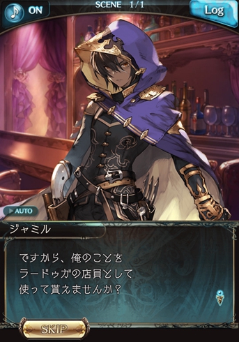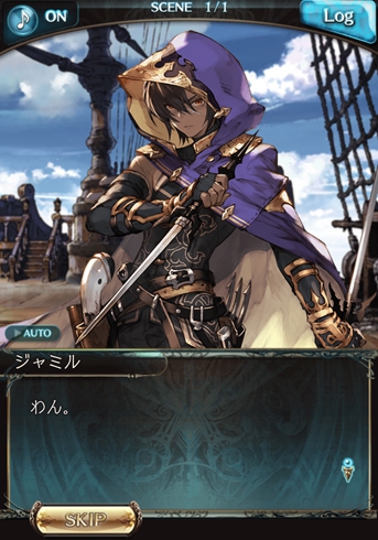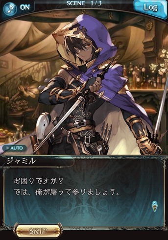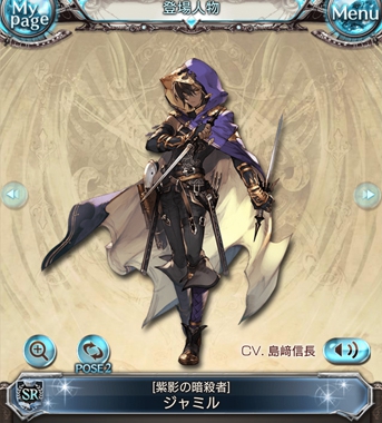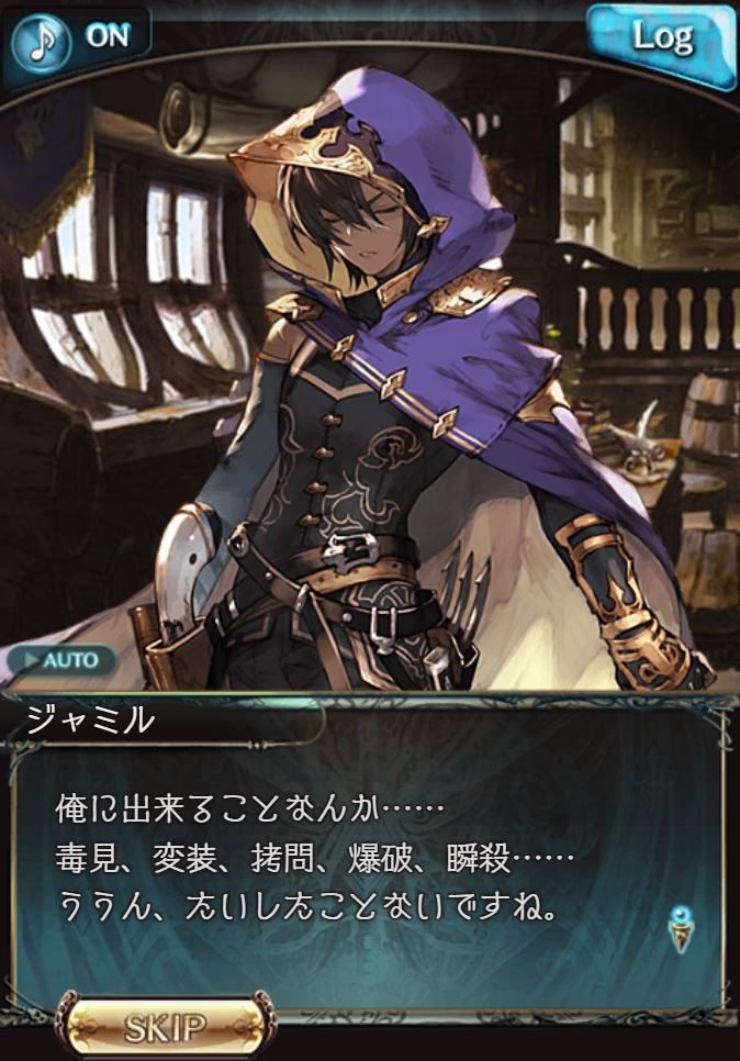 今は滅びし誇り高き一族の末裔は、その元凶に復讐を果たすため、空の旅に出る。門外不出の技で切り開き、忠義を尊ぶ澄んだ瞳が映す真実は、光か闇か。(ルリアノート登場人物紹介 Sレア[紫影の暗殺者]ジャミル より)