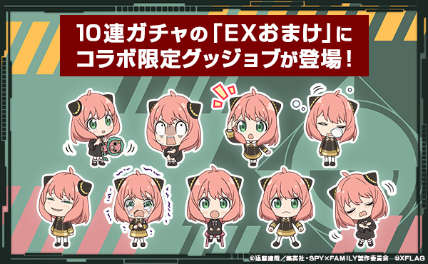また、ガチャ“超・獣神祭×『SPY×FAMILY』”で10連ガチャを引くと“EXおまけ”として“アーニャ・フォージャー”の“コラボ限定グッジョブ”が9種類の中からいずれか1種類付いてきます。