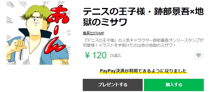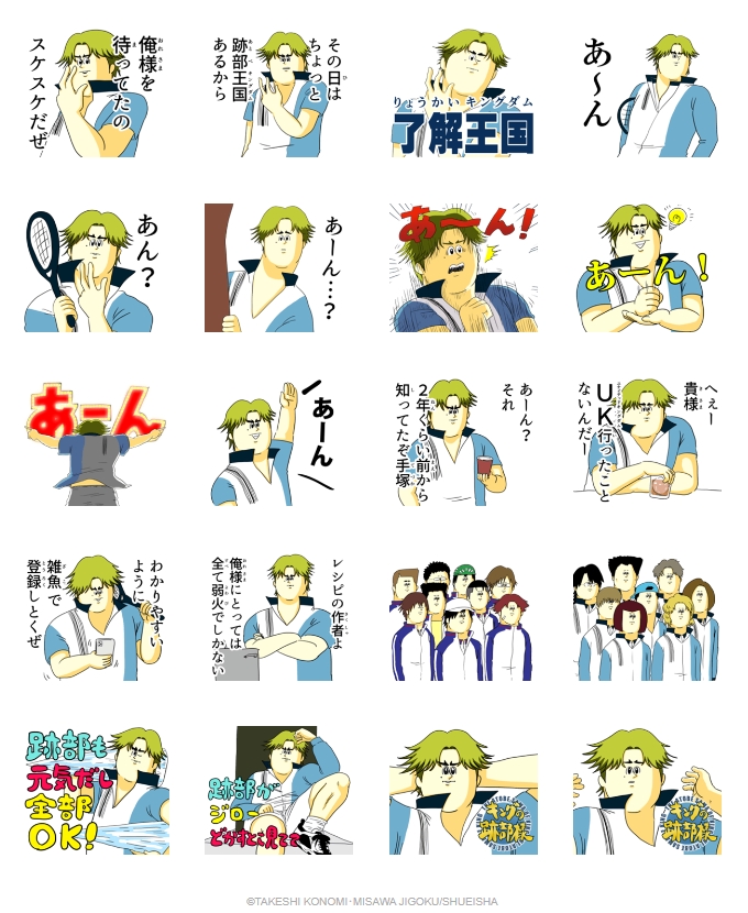 『テニスの王子様』の人気キャラクター跡部景吾オンリースタンプが初登場。スタンプは全40種で、イラストを手掛けたのはあの地獄のミサワさんです。