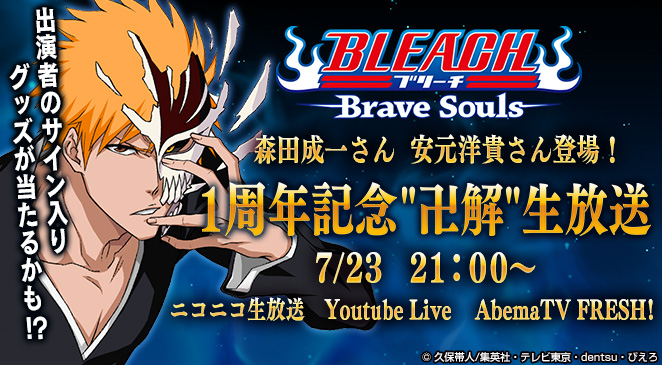 これを記念し黒崎一護役の森田成一、茶渡泰虎役の安元洋貴、檜佐木修兵役の小西克幸ほか豪華キャストによる特別番組『BLEACH Brave Souls 1周年記念 “卍解”生放送!』の生放送を、7月23日(土)の夜9時から実施する。