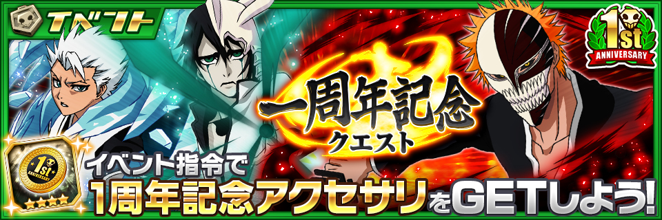 『BLEACH Brave Souls』1周年を記念した特別なイベントクエストを開催します。さまざまな難易度のソロステージや共闘ステージのほか、特別ストーリーが繰り広げられる1周年記念イベントも実施します。またイベントをクリアすると、1周年記念の限定アクセサリを獲得できます。