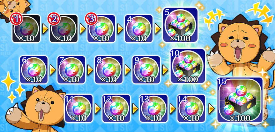 1周年記念のログインボーナスキャンペーンでは、毎日ログインするごとにアイテム・霊玉がプレゼントされ、期間中には最大で合計420個の霊玉を獲得することができる。さらに通魂符75枚、15万環も獲得できる。