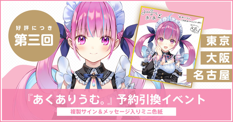 好評につき『あくありうむ。』の早期予約引換イベント三回目が10月1日に東京・大阪で開催決定。対象商品をご予約して頂いた方に、複製サイン&メッセージ入りミニ色紙をプレゼントいたします。