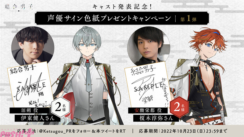 キャスト発表を記念して、声優サイン色紙プレゼントキャンペーン第1弾を開催。『結合男子』公式Twitterをフォローして、応募期間までに対象ツイートをリツイートした方の中から抽選で各2名に、源朔役・伊東健人さん、安酸栄都役・榎木淳弥さんのサイン色紙が当たります。