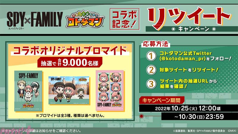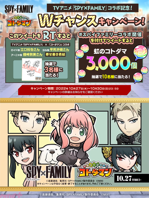 また、リツイートのほかに、Wチャンスとして“#スパイファミリーコラボ開催”を付けたツイートを投稿で虹のコトダマ3,000個が抽選で10名に当たります。
