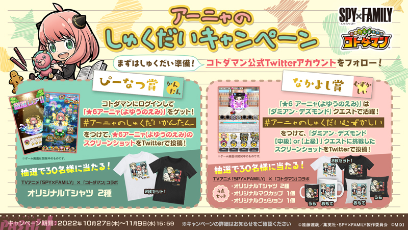 “なかよし賞”は、“ダミアン・デズモンド”【中級・上級】のクエスト画面のスクリーンショットを撮影し、ハッシュタグ“#アーニャのしゅくだいむずかしい”を付けてツイートすると、“コラボオリジナルTシャツ2種セット”、“オリジナルマグカップ”、“オリジナルクッション”の4点セットが抽選で30名に当たります。