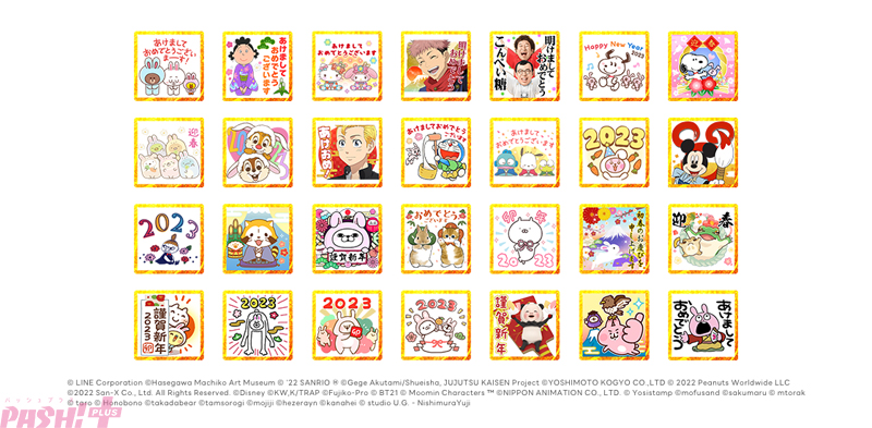 『あけおめスタンプ2023』は、スタンプ周囲の金枠が目印です。『サザエさん』、『呪術廻戦』、『東京リベンジャーズ』、“ジョイマン”などの人気キャラクターや今年の干支である“卯”の人気キャラクターなどのLINE公式スタンプを本日より順次販売します。