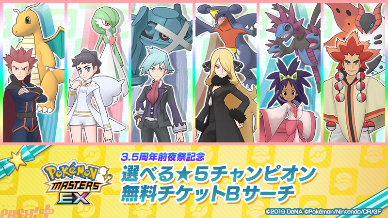 現在、“3.5周年前夜祭記念 選べる★5チャンピオン 無料チケットBサーチ”を開催中です。本バディーズサーチは、“10連バディーズサーチ”実行後に、“ワタル&カイリュー”や“シロナ&ガブリアス”など6組のチャンピオンから1組を選んで仲間にできるチケット専用バディーズサーチです。