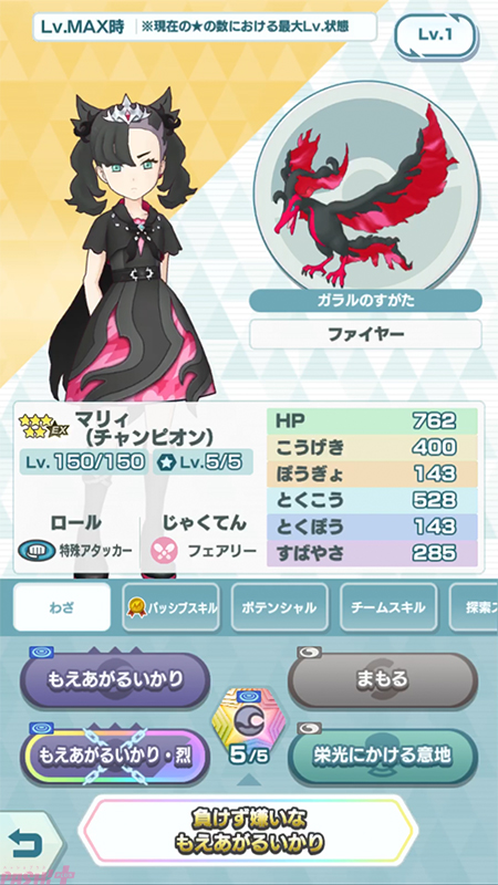 “★5マリィ(チャンピオン)&ファイヤー”は、アタッカーのバディーズのため、“★6EX”に★アップすると、バディーズわざが全体攻撃になります。