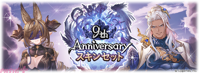 3月10日19:00 より、“9th Anniversary スキンセット”が販売。本キャンペーンでは“レジェンド10連ガチャチケット”1枚と“キャラ専用スキン”1種類のセットを、3,000モバコイン、3,000グラブルコイン、3,000GREEコイン、または3,000DMMポイントで購入できます。