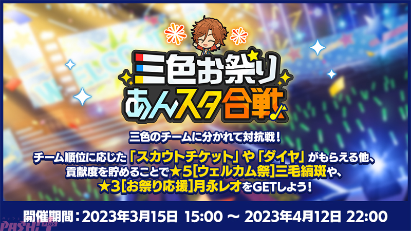 三色のチームに分かれた対抗戦イベントを実施します。チーム順位に応じ、“スカウトチケット”や“ダイヤ”がもらえる他、貢献度を貯めることで★5[ウェルカム祭]三毛縞斑や、★3[お祭り応援]月永レオを獲得できます。