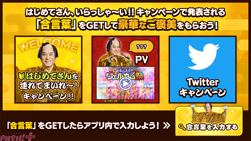 PVやTwitterキャンペーンなど、“はじめてさん、いらっしゃ~い!!”キャンペーン各所で発表される合言葉をアプリで入力することで、豪華ご褒美をもらえるキャンペーンを開催します。