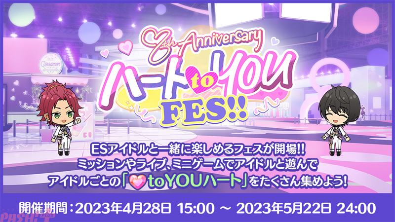 ESアイドルと一緒に楽しめるフェスが開場。ミッションやライブ、ミニゲームでアイドルと遊んで“to YOU ハート”をたくさん集めましょう。“to YOU ハート”を集めると、周年記念衣装“アニバーサリーラブ”のルーム衣装やMV衣装(Music)がもらえるほか、アイテムや限定称号、マイチケットメーカーで使えるシールなどももらえます。