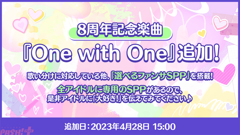 8周年を記念した楽曲『One with One』を追加。歌い分けに対応している他、“選べるファンサ SPP”を搭載。全アイドルに専用のSPPがあるので、是非アイドルに“大好き!”を伝えてみてください。声援募集キャンペーンも開催。『One with One』を覚えてコールを録ってアイドルに届けてみては?