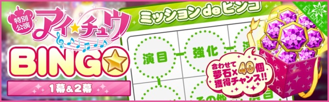 概要:『アイ★チュウ』コラボ特別公演記念ビンゴを、期間中2幕に分けて行います。ビンゴカードに記載されているミッションをクリアすると、「夢石」などのアイテムが手に入ります。
