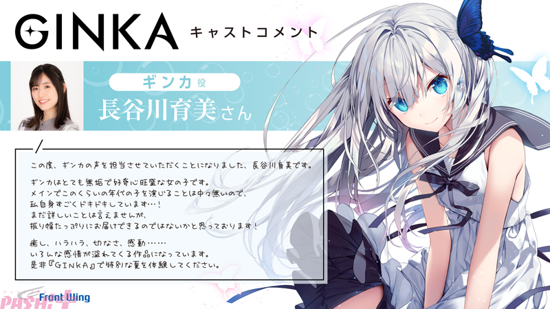 グリザイアシリーズなどを制作するフロントウイングによる新作PCゲーム『GINKA』。本作のメインヒロインであるギンカ役が長谷川育美さんに決定しました。また、オープニングテーマ『Star Trail』歌唱も長谷川さんが担当することが明らかとなりました。