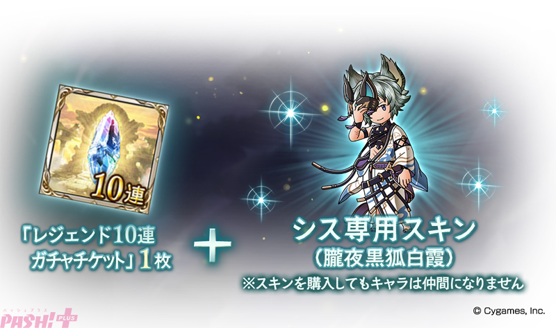 “レジェンド10連ガチャチケット”1枚と“キャラ専用スキン”1種類のセットを、3,000モバコイン、3,000グラブルコイン、3,000GREEコイン、または3,000DMMポイントで購入できます。1人1回のみの販売です。